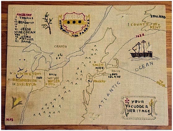 Family Family Heirloom that helped connect the dotsIt seems each family has one or two members within it that take a particular interest in discovering and preserving their family history. Those people become their own family historians. I’m thankful to those who have taken on that role, including my great aunt Marty. She handmade a family heirloom that was passed down to me–a detailed map of my Scudder heritage. The next step was to follow the link I found on scudder.org to Scudder Ancestors in America.com for my direct lineage and compare that information to the map.